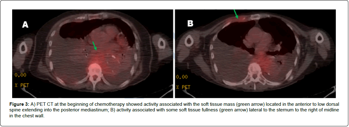 Figure 3: A) PET CT at the beginning of chemotherapy showed activity associated with the soft tissue mass (green arrow) located in the anterior to low dorsal spine extending into the posterior mediastinum; B) activity associated with some soft tissue fullness (green arrow) lateral to the sternum to the right of midline in the chest wall.