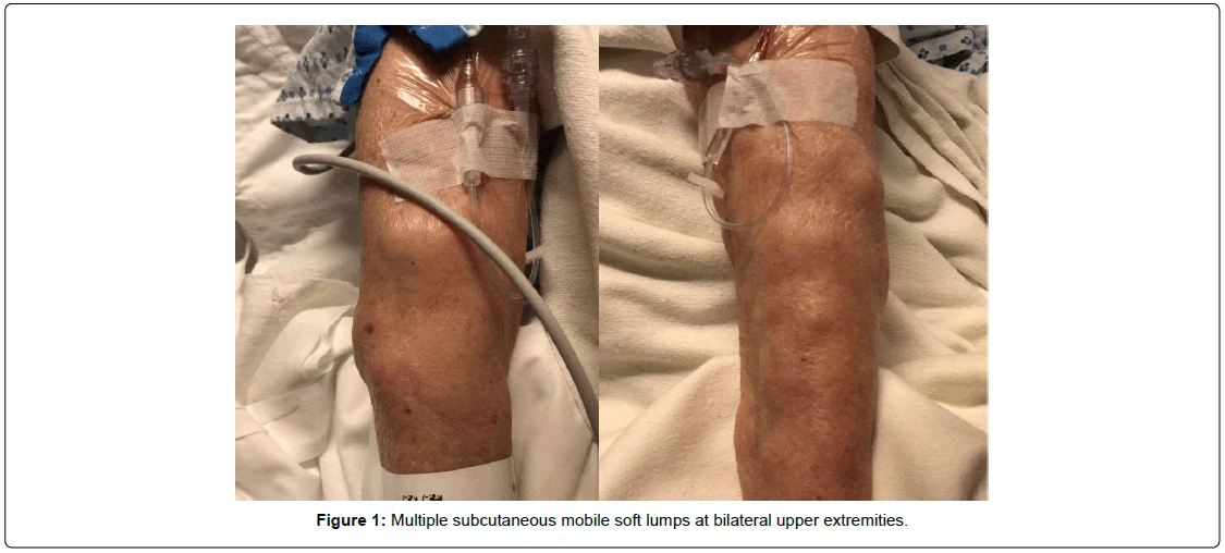 An 81-year-old woman with prior history of surgery to remove symptomatic left cavernous hemangioma 15 years ago in Guatemala complicated by residual dysphasia presented with productive cough and dyspnea on exertion of 4 weeks duration. Initial vital signs were: temperature 97.2°F, heart rate 98 beats per minute, blood pressure 168/76 mmHg, respiratory rate 20 breaths per minute, and oxygen saturation 92% on room air. Physical exam found multiple soft, subcutaneous, and mobile lumps on bilateral upper extremities (Figure 1). Chest auscultation demonstrated bibasilar rales, bilateral end expiratory wheezing, and significantly decreased breath sounds over right lower lung field. Labs revealed serum protein 7.7 g/dL, albumin 3.2 g/dL, Serum Lactate Dehydrogenase (LDH) 152 U/L, corrected calcium 9.9 mg/dL, and negative respiratory virus Polymerase Chain Reaction (PCR). Complete blood cell count with differential, creatinine, liver function tests, lactic acid, troponin I, procalcitonin, pro-BNP, blood cultures, and electrocardiogram were unremarkable. Chest x-ray was notable for cardiomegaly, edema, and bilateral pleural pulmonary effusions.