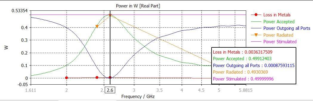 B. Voltage Standing Wave Ratio (VSWR): According to [10] VSWR should be between 1 and 2. In Figure 3 shows VSWR of dipole antenna less than 2. The good result of VSWR takes it from CST equal 1.128. In figure 4 describes the different real power for this pro-posed antenna. The power losses in the metals is 0.003618W and accepted power is 0.49...W.