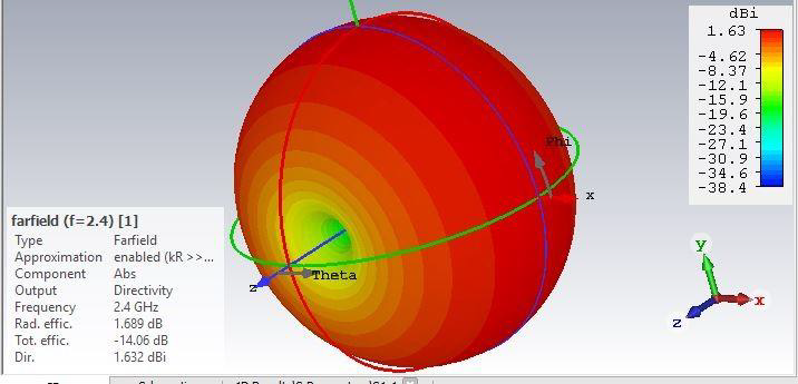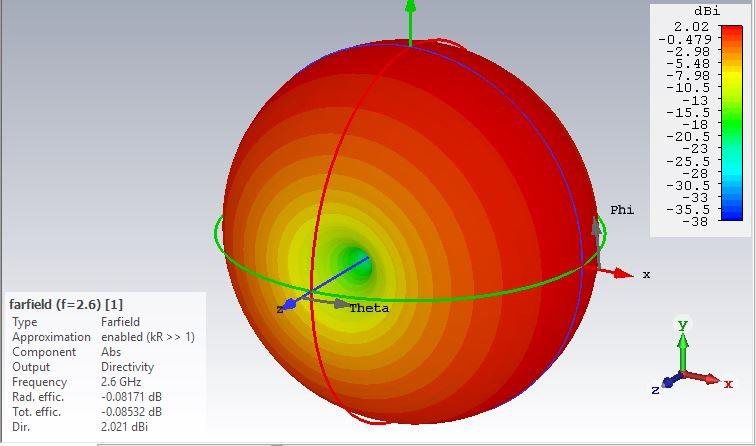 High gain measured at 2.6GHz equal 1.951dB as shown in Fig. 4. Far-field radiation pattern has been shown in the Fig.8. Directivity has found as 2.026 dBi. Obtained directivity was almost identical to the theoretical ones [7]. Red color shows the maximum radiation.