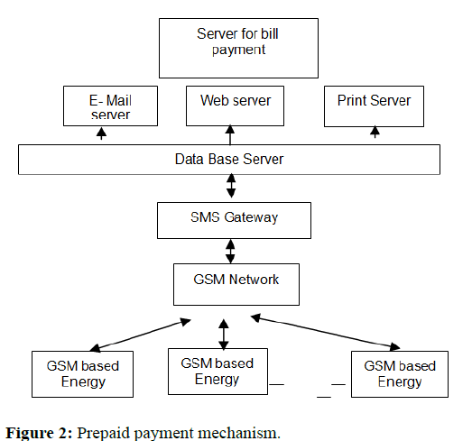 Prepaid payment mechanism: In the proposed prepaid energy meter, the payment has to be done before utilizing the energy e.g. mobiles. It resembles the concept of prepaid mobile SIM. The (IEC 62056-21:2002 standard) describes a method for direct local data exchange. Control of recharging energy meter is in the hands of electricity board and the consumer. The consumer will pay and electricity board will recharge energy meter according to payments. Recharging of energy meter is completely wireless if energy meter has zero balance then all home appliances will go off automatically. A microcontroller attached with energy meter helps in monitoring the balance and also reads the status of various sensors that is displayed on screen. The speed of microcontroller is in micro seconds. LCD is a display device. The data is transferred via GSM and monthly bills are made after manipulation by the software. Each system has specific ID number which will be provided according to SIM card unique service number. The meter reading is stored in database server through SMS gateway. After billing calculation, a bill is issued by energy provider company which can be sent either by email, by web account or by post. Customers can pay the bill using net banking. GSM also sends the information of power cut, power consumption and power theft through SMS. This sim card service number is used to identify and retrieve customers detail for billing and identification purpose. The entire process is shown in Figure 2 [5].
