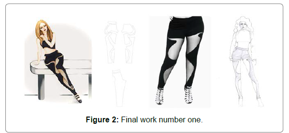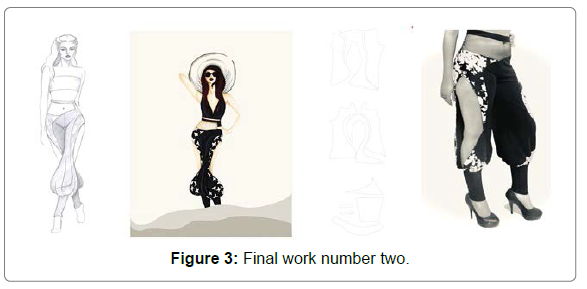 Number 1: The waves of the sea, as well as the idea of mixing shorts and pants, inspired these pants. These tight-fitting pants have a Tights-like silhouette. The color of these black pants and their length below the ankle has been considered to lessen the effect of these lines and also because they feature aesthetic elements with circular forms that can make a person look larger. However, the style of these pants will generally show the person’s natural silhouette. Knitted fabric and elastic lace are utilized in these pants (Figure 2).