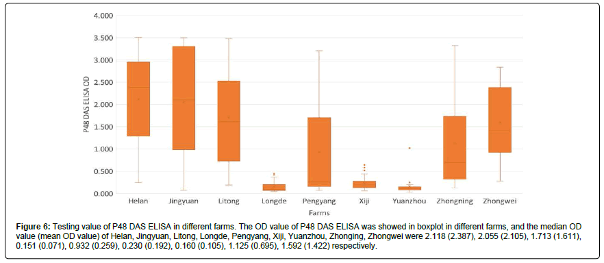 Figure 6: Testing value of P48 DAS ELISA in different farms. The OD value of P48 DAS ELISA was showed in boxplot in different farms, and the median OD value (mean OD value) of Helan, Jingyuan, Litong, Longde, Pengyang, Xiji, Yuanzhou, Zhonging, Zhongwei were 2.118 (2.387), 2.055 (2.105), 1.713 (1.611), 0.151 (0.071), 0.932 (0.259), 0.230 (0.192), 0.160 (0.105), 1.125 (0.695), 1.592 (1.422) respectively.