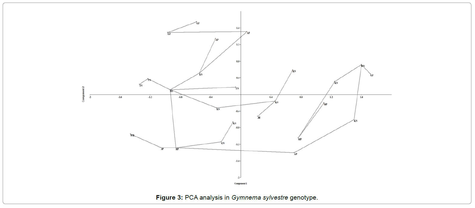 Furthermore, a dendrogram encompassing all 25 genotypes of G.Sylvestre collected from different locations across India used in this study was also built based on EST-SSR markers. The results showed all the varieties of G. sylvestre were clustered in two main groups. Genotypes DGS 16 and DGS 34 were the most dissimilar genotypes in which DGS 16 was collected from Tamilnadu and DGS 34 was collected from Jharkhand. DGS 15 and DGS 8 both were collected from the same state (Karnataka) but were falling under different clusters. DGS 1, 2, 3 were collected from Gujarat in which DGS 1 and 3 both are having similarity and falling under the same cluster but DGS 2 is falling under different cluster. Whereas Genotypes collected from Andhra Pradesh (DGS 19, DGS 20, DGS 22 and DGS 23) and Tamilnadu (DGS 16, DGS 17, and DGS 18) were covered under cluster B.Thus, disorderly distribution of genotypes of same state in different clusters was revealed from this study. Central location of the genotype collected from Rajasthan in the minimum span tree of the PCA may be because that the G. sylvestre may not be monophyletic. At the same time, it is pertinent to mention here that G. sylvestre is an important medicinal plant people have been using from ancient time and therefore, it is also presumed that it would have been migrated to different places which may be the reason behind messy distribution of genotypes in this study.