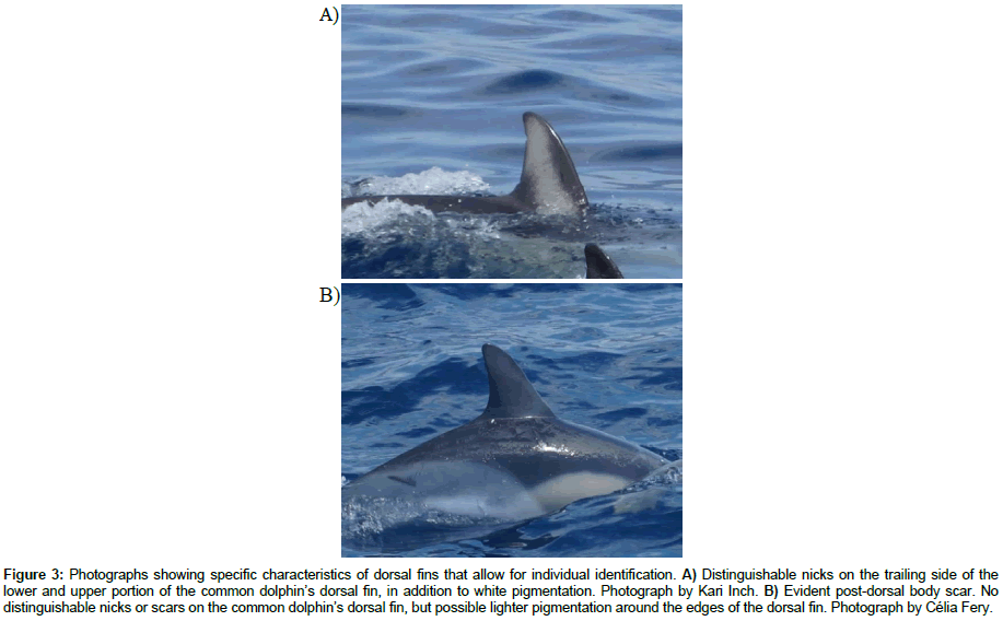 Figure 3: Photographs showing specific characteristics of dorsal fins that allow for individual identification. A) Distinguishable nicks on the trailing side of the lower and upper portion of the common dolphin’s dorsal fin, in addition to white pigmentation. Photograph by Kari Inch. B) Evident post-dorsal body scar. No distinguishable nicks or scars on the common dolphin’s dorsal fin, but possible lighter pigmentation around the edges of the dorsal fin. Photograph by Célia Fery.