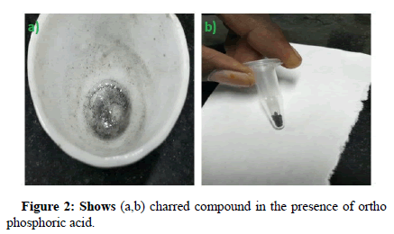 The similar experiment was carried out using same amount of zinc acetate and Benzene-1,4-Di-Carboxylic acid (BDC) with few drops of ortho phosphoric acid as initiator. Since phosphoric acid is a good initiator, we expected to get a good product [19]. The product gets charred and huge amount of fumes are released.
