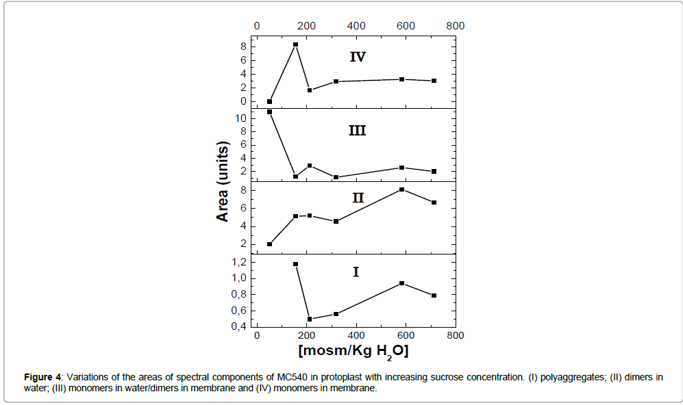 The effect induced by osmotic pressures produced by sucrose as osmolyte on the surface of protoplasts is followed by the spectral changes of MC540 in (Figure 2) Increasing sucrose concentrations promote the appearance of a shoulder at 570 nm and a decrease in the peak at 504 nm in the range of 49.5 at 154.7 mosm/Kg H2O.