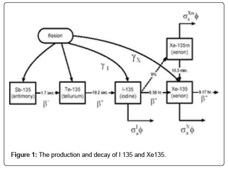 Xenon is a noble gas that has an atomic number of 54 and an atomic mass of 131.3 g/mol. It has nine stable isotopes and seven known radioactive isotopes [1]. During a nuclear fission reaction process, a fissile nuclear fuel such as U-235 undergoes a chain of reactions as a result of capturing a thermal neutron. The captured neutron distorts the U-235 nucleus, and the electrostatic repulsion force overcomes the nuclear attraction causing a split into two fission fragments [2-5]. This process is accompanied by energy release in the form of gamma rays as well as neutron emission. Some of the neutrons are released spontaneously while smaller numbers are delayed due to radioactive decay of certain fragments. The fission process produces several neutrons that play major role in sustaining the chain reactions. The fission process releases fragments of different mass numbers mainly around 90 and 140, most of which are radioactive [6-7]. These fission fragments would decay, each with different half-life, to reach stable end products. Therefore, there would be a series of fragments decay that are inevitable. It is important to keep the chain reaction sustained to ensure neutrons growth to the desired level to deliver the required power output. One critical stage of the fission reaction is the formation of I-135, a subsequence of Te-135 beta decay. The I-135 is a weak neutron absorber and has a half-life of 6.7 hours. The beta decay of I-135 to Xe-135 introduces a very powerful neutron absorber product. Xe-135 has a large cross section of 2.6 million barns. [8] This is about 5128 times higher than the thermal cross-section of U-235, which are 507 barns [9]. A barn is equivalent to 10-28 m2. This makes it an effective neutron absorber with a high interaction probability with the thermal neutrons. Xe135 is produced with about 5% probability from every fission process but with 95% probability from I-135 decay. [10-12] Xe-135 has a half-life of 9.1 hours. Increment in Xe-135 concentration in the reactor stops the neutron growth due its large cross-section. Absorption causes the formation of a stable isotope, Xe-136 [7]. The neutron population decreases, and the chain reaction stops. The reactor eventually shuts down due to Xenon accumulation. Understanding how to deal with the produced Xe-135 is essential to keep the reaction chain sustainable and the neutron flux at desired rate.