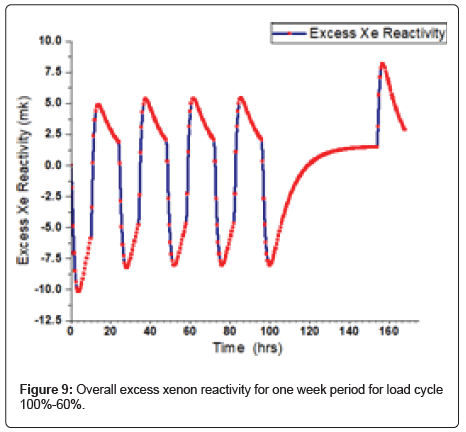 In this case the reactor power is varied from 100% to 60% FP during the load cycle of a week. At the end of first 24 hours of operation, i.e., on Tuesday 7:30 pm excess Xenon reactivity is +4.88941386 mk as shown in Figure 6. This excess positive reactivity of Xenon can be