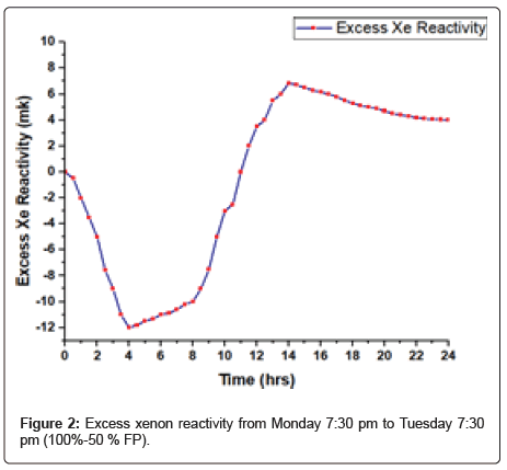 In this load cycle we have varied the reactor power from 100 to 50%FP during the load cycle of a week. We have calculated the Iodine concentration, Xenon concentration, and also excess xenon reactivity during the load cycle. At the end of first 24 hours of operation, i.e., on Tuesday 7:30 pm the maximum xenon reactivity is +6.85 mk. This excess positive reactivity can be brought in control using liquid zone controllers which provides +3 mk to -3 mk reactivity by raising the level of light water in the zones and by using boron poison in small concentration of 0.1 ppm The excess xenon reactivity for the first time period from Monday 7:30 pm to Tuesday 7:30 pm as shown in Figure 2.The excess xenon reactivity for the first time period from Monday