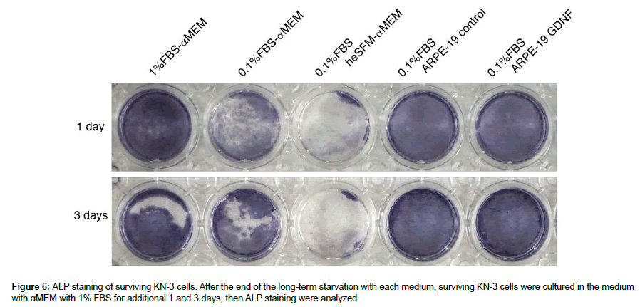 Surviving KN-3 cells post 7 day starvation were cultured in αMEM with 1% FBS for an additional 1 and 3 days, and then processed for ALP staining and quantification of ALP activity. ALP staining was observed in the cells of 0.1% FBS-αMEM, 0.1% FBS ARPE-19 control, and 0.1% FBS ARPE-19 GDNF groups, but not in that of 0.1% FBS heSFM control group (Figure 6). ALP activity of 0.1% FBS-αMEM, 0.1% FBS ARPE-19 control, and 0.1% FBS ARPE-19 GDNF groups increased in a time dependent manner (Figure 7).