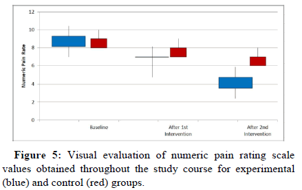Table 2: Numeric Pain Rating scale values obtained throughout the study course for experimental and control groups.