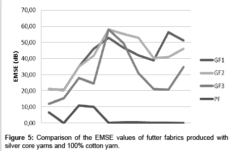 Figures 3-5 show that high EMSE (Electromagnetic Shielding Effectiveness) results can be obtained from the knitted fabrics produced with silver core yarns. It was observed that conductive fabrics have high EMSE values when compared to cotton fabrics. 2 yarn futter knitted fabrics showed higher values compared to jersey and rib fabrics, due to higher amount of conductive yarn in unit area of the fabric. It was also seen that higher shielding effectiveness results were obtained with conductive filaments in the structure. Therefore the highest results were obtained with GF1 and GF2 fabrics; which are compared to jersey and rib. Also the fabrics that contain copper have high EMSE values.