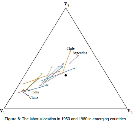 Regularity 2 is clearly supported by all the data presented in our paper. As we can see in Figures 5-7, the trajectory segments representing the nowadays labor allocations in the groups ‘highly developed countries’ and ‘OECD countries’ are close to v3, i.e., these countries are dominated by services at the present. Furthermore, the trajectory segments representing the nowadays labor allocations in the world regions depicted in Figure 11 are close to v3; the same is true for the trajectories representing the nowadays labor allocations in high-income and upper middle-income countries depicted in Figure 12. The labor allocations of emerging countries (China and India aside) converged to v3 (exactly speaking, these countries’ services shares increased) between 1950 and 1980 as shown in Figure 8. In general, the dynamics of non-OECD countries depicted in Figures 9 and 10 reveal a convergence to v3 (i.e., an increase in the services share).