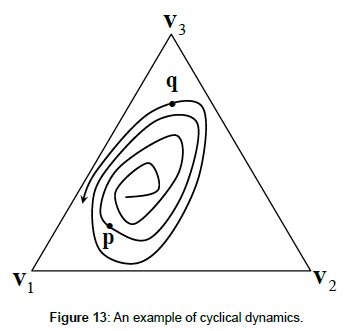 Figures 6, 7, 9, and 10 generate the impression that the trajectory portrait (or: the vector field implied by all the trajectories) depicts a non-monotonous movement: in general, the tangential vectors that are located close to the vertex v1 point away from the v3v1-edge of the simplex (i.e., they are characterized by 0° < α < 60°), while the tangential vectors that are close to the vertex v3 point rather towards the v3v1-edge of the simplex (i.e., they are characterized by 60° < α < 120°). However, at the same time, we can see that many trajectories deviate from Regularity 4, not only in Figures 6, 7, 9, and 10, but also in Figures 11 and 12.