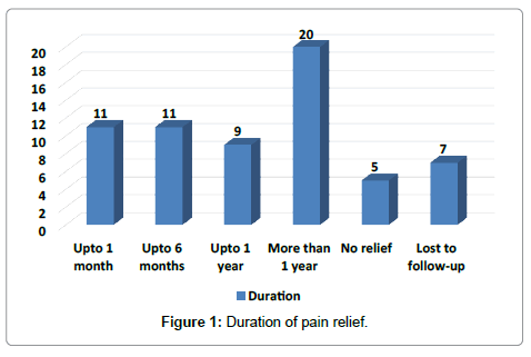 Pain relief was assessed on a scale of 0 to 10, with 0 being no relief and 10 being complete relief in pain. Patients who reported score of 0 to 2 were included in the no relief category, those with scores of 3 to 7 were included in the partial relief category, and those with scores of 8 to 10 were included in the significant relief group.