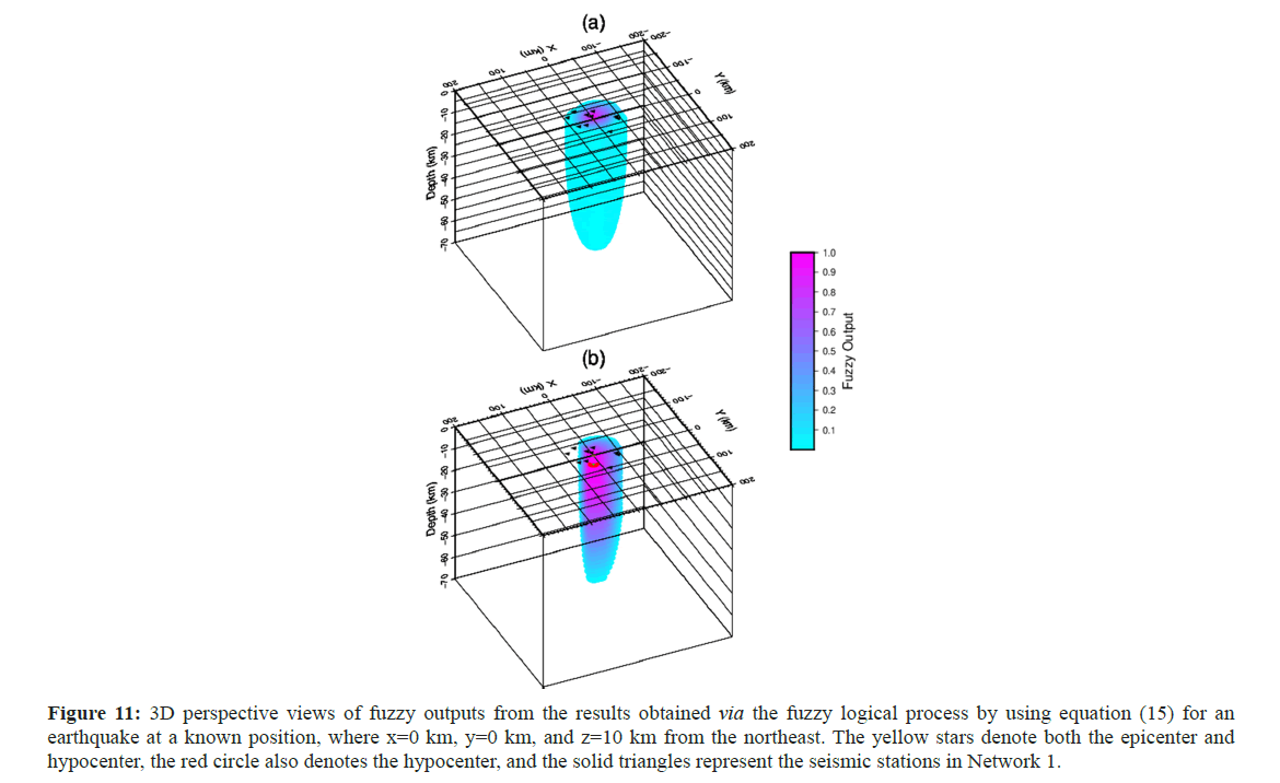 Again, the highest fuzzy output values correspond to the hypocentral location. While real hypocenter coordinates are determined using this method, coordinates are estimated as x=0.25 km, y=-0.25 km, and z=11 km under the nonideal conditions applied in this part of the current study. This method provides more accurate results by defuzzifying the values obtained from the sum of the four fuzzy outputs.