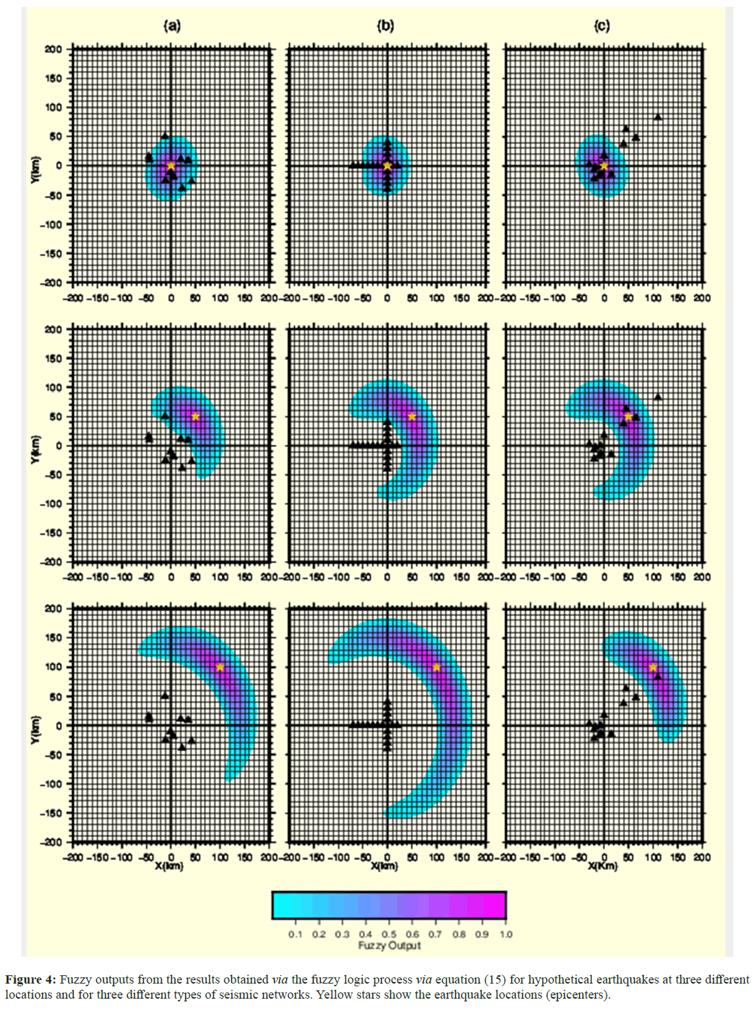 Figure 4: Fuzzy outputs from the results obtained via the fuzzy logic process via equation (15) for hypothetical earthquakes at three different locations and for three different types of seismic networks. Yellow stars show the earthquake locations (epicenters).