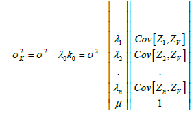 The system enables to find all the weights λ0 that minimize the variance and make the estimator unbiased. The variance of kriging is then obtained by the following formula: