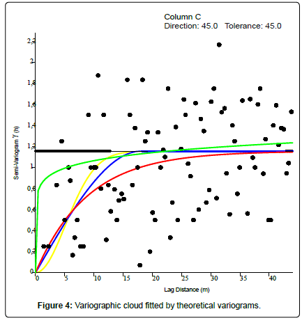 Variogram analysis of field data: Figure 4 shows the scatter plot of the experimental variogram and the four types of theoretical models selected for its adjustment. Overall, all models lift first and then stabilize over greater distances beyond a certain range. The experimental variogram is a graph that shows the contributions of each pair of points to the final variogram. The scatter plot gives a visual impression of the dispersion of values at different offsets. He has no precise direction. The colored variograms were tested to find the variogram able of fitting the variographic cloud. This simulation shows that the yellow Gaussian variogram is the one that can best fit the field data. The directions and tolerances (Table 1) indicate the size of the angular window each time. We chose these directions and tolerances to obtain omnidirectional variograms that neglect the lag h.