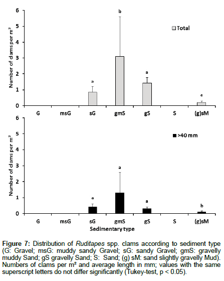 Figure 7: Distribution of Ruditapes spp. clams according to sediment type (G: Gravel; msG: muddy sandy Gravel; sG: sandy Gravel; gmS: gravelly muddy Sand; gS gravelly Sand; S: Sand; (g) sM: sand slightly gravelly Mud). Numbers of clams per m² and average length in mm; values with the same superscript letters do not differ significantly (Tukey-test, p < 0.05).