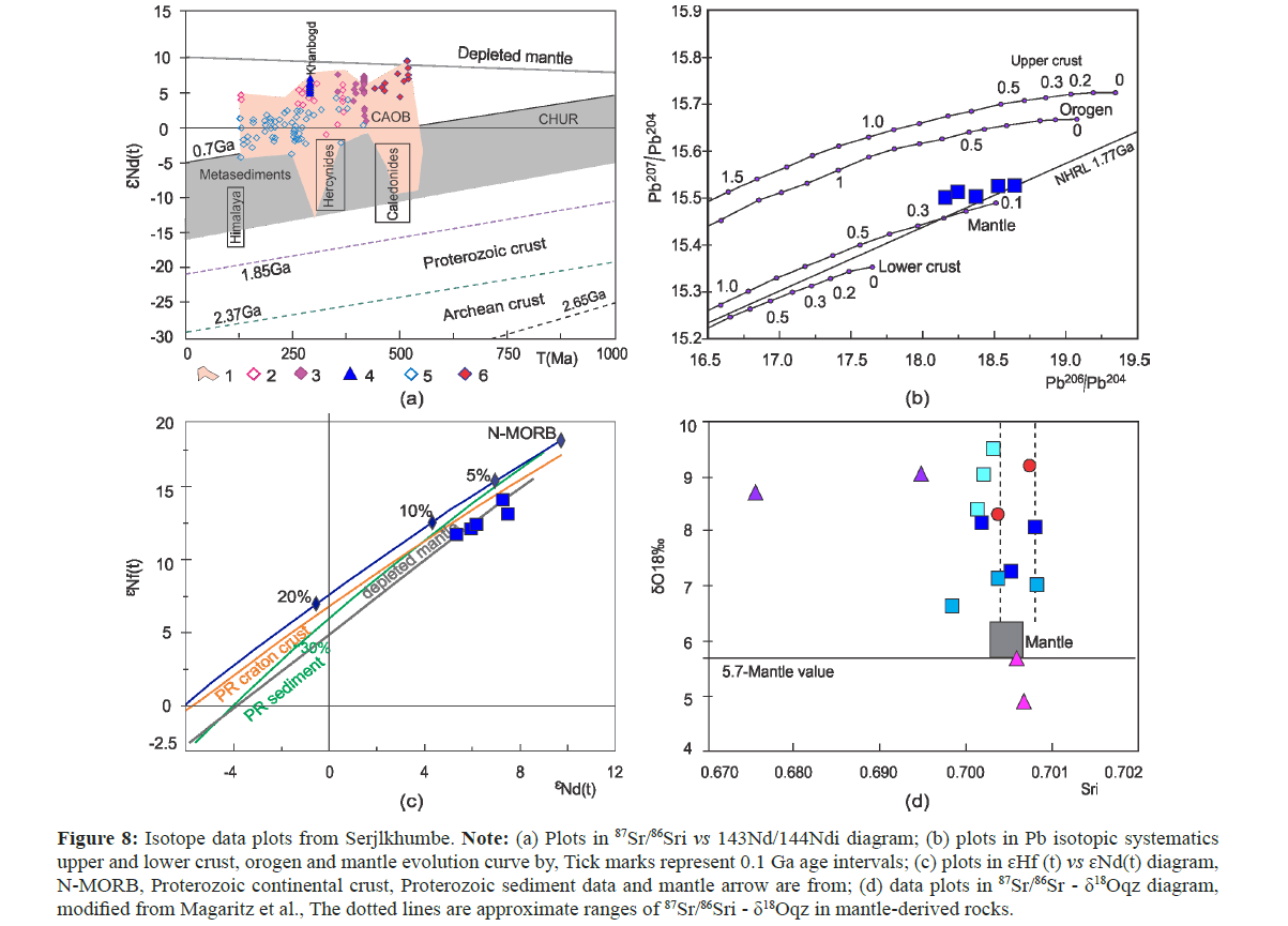 Figure 8: Isotope data plots from Serjlkhumbe. Note: (a) Plots in 87Sr/86Sri vs 143Nd/144Ndi diagram; (b) plots in Pb isotopic systematics upper and lower crust, orogen and mantle evolution curve by, Tick marks represent 0.1 Ga age intervals; (c) plots in É?Hf (t) vs É?Nd(t) diagram, N-MORB, Proterozoic continental crust, Proterozoic sediment data and mantle arrow are from; (d) data plots in 87Sr/86Sr - δ18Oqz diagram, modified from Magaritz et al., The dotted lines are approximate ranges of 87Sr/86Sri - δ18Oqz in mantle-derived rocks.