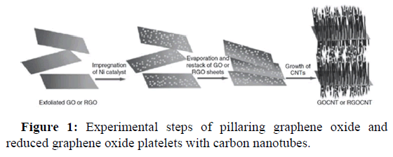 The CVD method was used by Zhang, et al., in which chemically exfoliated RGO was pillared with CNTs. Figure 1 shows that the solution of Ni(NO3)2 was mixed into chemically exfoliated graphene oxide or reduced graphene oxide platelets in water. Nickel including GO and reduced graphene oxide platelets were achieved by drying at 60℃ and were utilized as the catalyst in the CVD technique to grow carbon nanotubes with acetonitrile as the source of carbon. A robust three dimensional porous structure was formed by this composite material with reduced graphene oxide layers pillared by carbon nanotubes. On varying, the CVD time and the catalyst loading, the growth of 1-D carbon nanotubes can be restricted. Brilliant photocatalytic performance derived by visible light was exhibited by the CNT pillared reduced graphene oxide composite materials for the degradation of rhodamine B. Composite materials are excellent photocatalyst due to effective photosensitized electron addition, decreased electron radical recombination, and high ability of adsorption.
