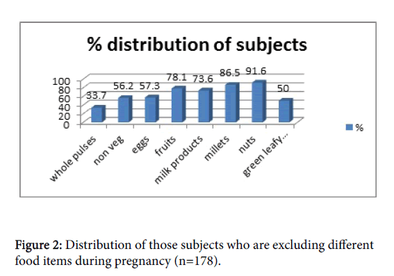 Figure 1: Shows that 86.41 percent of women were excluding different types of food items during pregnancy like whole pulses, eggs, nonvegetarian food (ish, eggs, meat, chicken), fruits (mango, litchi, papaya, pineapple, banana), milk products (buttermilk, curd), millets, nuts (almonds, pistachio, cashew, walnuts, etc) and green leafy vegetables. It was seen that 100 percent illiterate group who exclude the food were exclude nuts. he most excluded food item is nuts. Highest percentage of women in every category excludes nuts primarily followed by millets (86.52 percent), then fruits and milk products. hose who were non vegetarian were exclude non vegetarian food items (93.45 percent) and eggs (73.83 percent) during pregnancy and those who were eating eggs were exclude eggs (95.83 percent) during pregnancy.