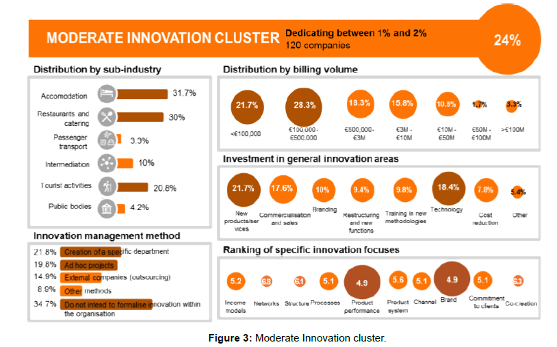 The Medium Innovation cluster is the largest, encompassing 28.3% of tourism industry firms, through primarily from the restaurant and catering (35.9%) and accommodation (32.4%) sub-industries. These companies mostly manage their innovation efforts by creating a specific department (27%) or through ad hoc projects (23%). On average, the companies bill between €100,000 and €3,000,000 (31% bill between €100,000 and €500,000, and 21.8%, between €500,000 and 3 million euros).
