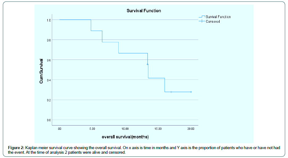 Statistical Analysis: Duration of response was calculated from date of documented response till progression or death. Progression Free Survival (PFS) was calculated from the date of starting chemotherapy to date of clinical or radiological progression or death or last follow up. Overall survival (OS) was calculated from start of treatment to date of death from any cause or last follow up. Kaplan Meier analysis was used to calculate the progression free and overall survival.