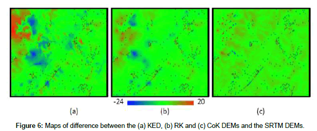 Figure 6 presents maps of differences between the derived DEM and the SRTM DEMs (KED-SRTM, RK-SRTM and CoK-SRTM). The hard samples were overlaid on the maps to assist analysis. Instead of global information, these maps allow to observe the spatial distribution of the differences. Blue regions mean negative differences where the SRTM elevation values are greater than the fused DEM. Green regions represent more similar values while the red ones show SRTM elevation values smaller than the derived DEM.