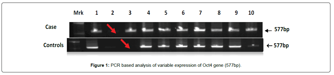 (Figure 1) showing PCR based analysis of differential frequency of OCT4 gene - expression between cases of NOA and controls. The highest frequency (9.3%) of over-expression were observed in NOA cases with calculated values of O.R (0.75) and C.I varying between 0.069-9.081 as compare to controls. The complete disappearance (null) of 577bp band were observed in 9.1% cases of NOA (arrow) consider as mutation. Apparently (Figure 2) bar diagram showing the DNACNVs also support the above findings that significant decreasing trend of OCT4 gene variations were observed with respect to controls, whereas case number two showing mutation (arrow) and case number three & four showing up-regulation (over-expression).