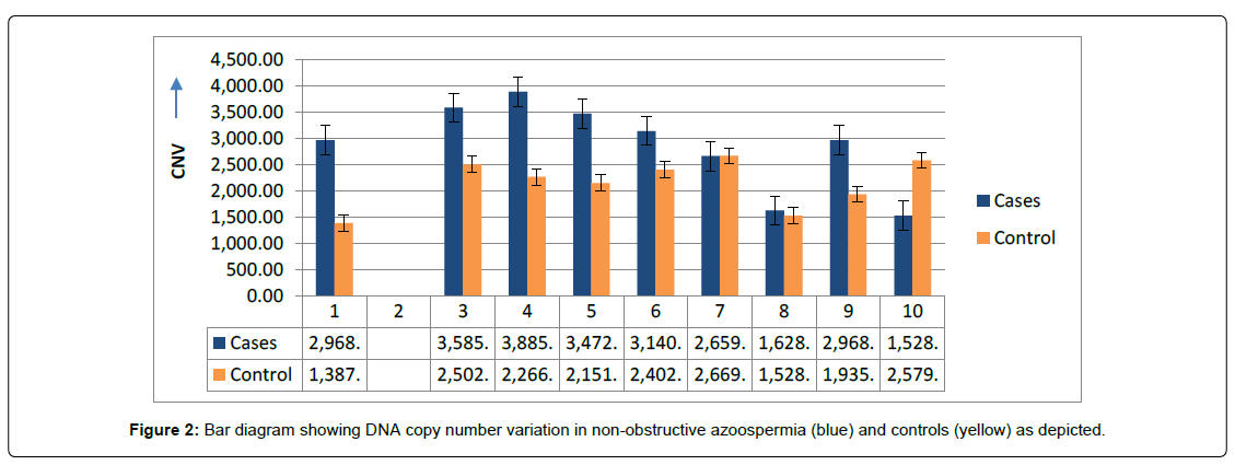 PCR based analysis of NANOG showing variable gene-expression between cases and controls. (Figure 3) showing the frequency (42%) of over-expression (up-regulation) with calculated values of O.R (0.07) and C.I varies at 95% interval between 0.029-1.43. The frequency (28.8%) of complete disappearance of band (151bp) was observed in the cases of NOA, consider as mutation and calculated values of O.R (0.14) with C.I varies from 0.029 to 0.687, showing highly significant differences (p<0.01) with respect to controls. The findings were further analysed and supported by DNACNVs variations, where the bar diagram showing systematic higher values in all the samples, except case number seven (bar), where, the frequency of controls observed more than NOA case as depicted in (Figure 4).
