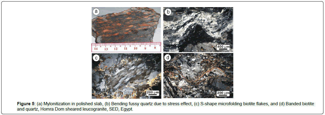 The alteration impacts on the essential minerals of these sheared rocks are as follows: (1) Quartz shows strong undulose extinction and fussy structure (Figure 5b). (2) Secondary quartz interstices show banding which indicates the recrystallization process (Figure 5c). (3) Potash-feldspars (perthites) are often stained with iron oxides and small plagioclase laths over-grow between the patchy perthite crystals. (4) Plagioclases occur as cloudy crystals due to moderate alteration and others plagioclase crystals are cracked and filled by iron oxides and quartz veinlets. (5) Deformed plagioclases are observed as dislocated lamellae. (6) Some plagioclase crystals extrude quartz as worms in the crystals producing myrmekitic texture and other crystals show zonation with alteration to muscovite and sericite. (7) Biotite show bending and forming S-shaped crystals (Figure 5d). (8) Fluorite veinlets are seen associated the other accessories and opaques.