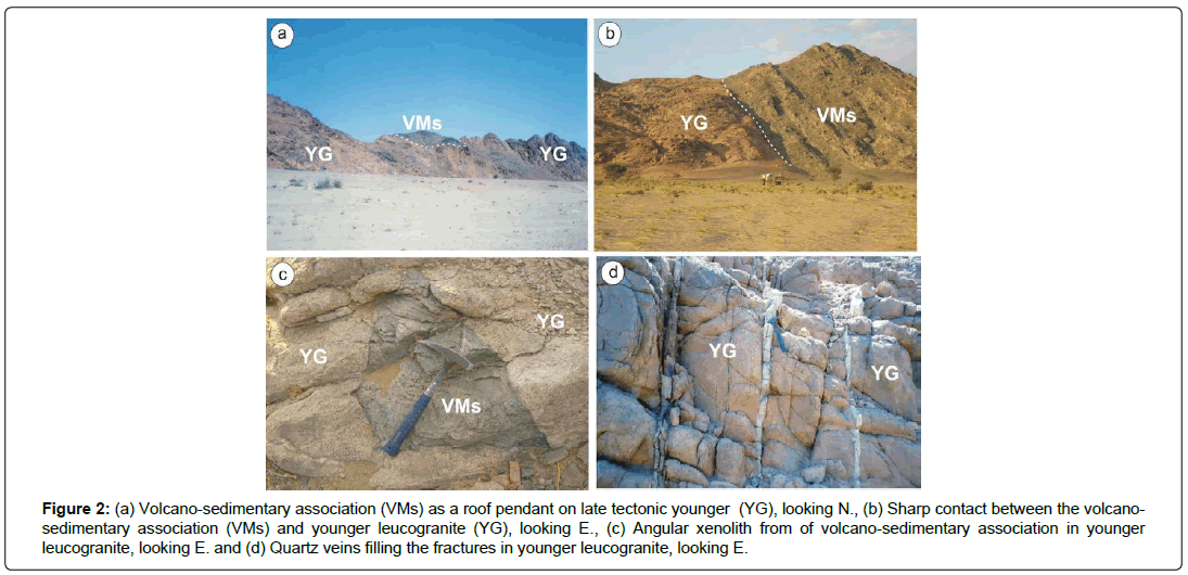The leucogranite of G. Homra Dom are characterized by low to moderate topography and cover about 25 km2. They form elongated mass in NNW-SSE direction with about 2 km in width and 12 km. in length (Figure 1). They are pink to buff in colour while near the southern contact they are highly reddish in colour due to the hematitization. G. Homra Dom leucogranite is essentially roughly parallel to the regional foliation of the surrounding country rocks. Such a foliation not only decreases with the increase lateral distance from the contact but also it markedly differs in intensity according to the adjacent rock. The contact between the younger leucogranite and the volcano-sedimentary association is of sharp nature (Figure 2b) and marked by a narrow thermal and tectonized zone up to 3-5 m thick [7]. G. Homra Dom leucogranite is highly sheared due to bounded by two major sinstral strike slip faults and also dissected by numerous of NE-SW dextral and NW-SE sinstral faults. Where are there may contain some angular xenoliths from volcano-sedimentary rocks (Figure 2c) and send apophyses into the volcano-sedimentary association. They are also characterized by exfoliations, taffoni weathering structure and fractures filled with quartz veinlets (Figure 2d).