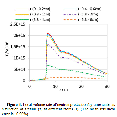 The above results reveal that spallation reactions occur remarkably only after about 6 cm altitude, but how their positions are distributed in the active zone? Is still not revealed. To answer this question, we proceeded to a local evaluation of the same neutronic quantity. In contrast to previous calculations, which were based on cumulative volumes, here we have estimated the neutron production rate on very small separate volumes. We have divided the most neutron contributing area (0 ≤ z ≤ 30 cm and 0 ≤ r ≤ 6 cm) into small cylindrical strips centered on the target axis, each having 3 mm height and 2 mm radial thickness. The obtained results are represented in Figure 4. The most notable observations in this figure are the sharp peaks at about z=7 cm and the nearly horizontal portions in ~12 cm ≤ z ≤ ~14 cm. In the remaining interval of z altitude, the neutron production rate only undergoes a steady decrease. In fact, these observations are only quite clear in the r ≤ 4 cm radius range. For higher radius, the peaks disappear progressively and the production rate becomes almost invariant with altitude. The fact that in the position of the peaks, the neutron production rate suddenly increases by a factor that can reach 20 or even more, proves that this position is a real center of spallation reactions. This is because only the spallation reaction that can reach this multiplication factor. Since the spallation reaction has the particularity of producing, at the same time, a large number of neutrons and protons and to verify the previous conclusions, we have also calculated the local rate of secondary protons. The obtained results are illustrated in Figure 5. They seem perfectly similar to those of the neutron production rate and show the same singularities, which confirms the conclusions made above. Finally, invoking the power deposition from the results obtained in our work [13], we can definitely confirm that two main generations of spallation occur in the active area of the MEGAPIE target: The first at the region ~6 cm ≤ z ≤ ~7 cm and the second at the region ~12 cm ≤ z ≤ ~14 cm. Figure 6 shows especially four singularities.