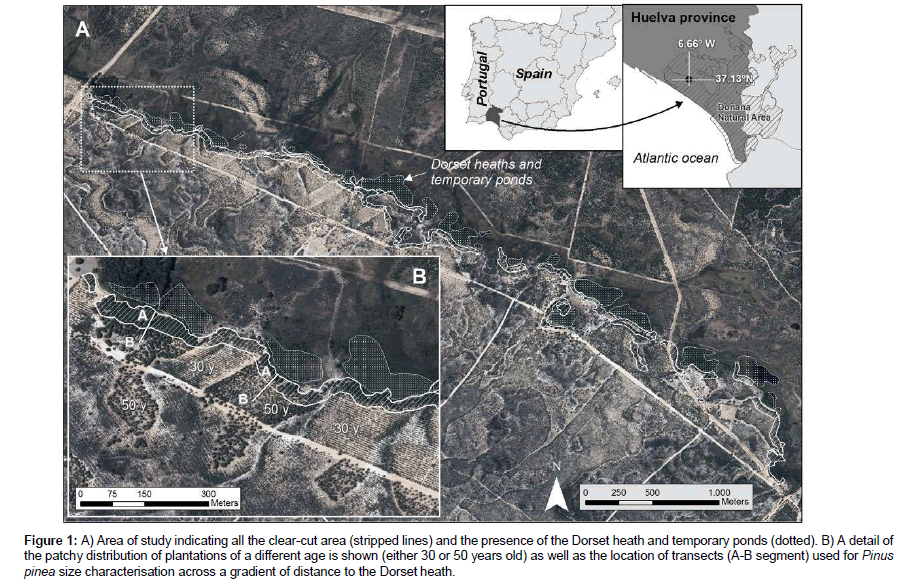 Figure 1: A) Area of study indicating all the clear-cut area (stripped lines) and the presence of the Dorset heath and temporary ponds (dotted). B) A detail of the patchy distribution of plantations of a different age is shown (either 30 or 50 years old) as well as the location of transects (A-B segment) used for Pinus pinea size characterisation across a gradient of distance to the Dorset heath.