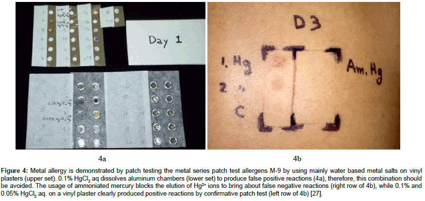 Figure 4: Metal allergy is demonstrated by patch testing the metal series patch test allergens M-9 by using mainly water based metal salts on vinyl plasters (upper set). 0.1% HgCl2 aq dissolves aluminum chambers (lower set) to produce false positive reactions (4a), therefore, this combination should be avoided. The usage of ammoniated mercury blocks the elution of Hg2+ ions to bring about false negative reactions (right row of 4b), while 0.1% and 0.05% HgCl2 aq. on a vinyl plaster clearly produced positive reactions by confirmative patch test (left row of 4b) [27].