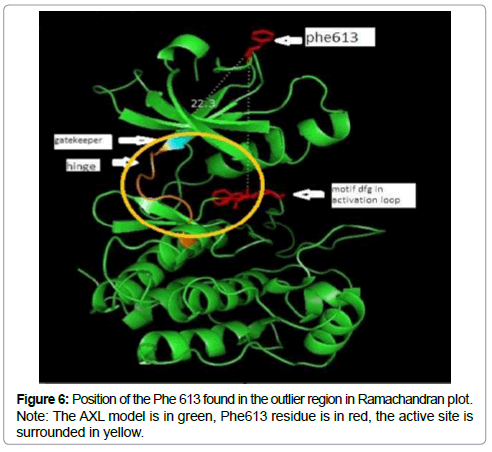 The sterochemical quality and accuracy of the predicted model was evaluated after the refinement process using the Ramachandran plot calculated with the PROCHECK program [23]. The π and ψ distributions of the Ramachandran plots of non-glycine, non-proline residues are represented in Figure 5, showing 93.3% (252 aminoacids) of residues in the favoured regions, 6.3% (17amino acids) in allowed region and 0.4% (1 amino acids) in outlier region Figure 6 shows the residue phenylalanine (Phe613) found in the outlier region is at very long distances from the pocket suggesting that this amino acid is structurally and functionally irrelevant to the ligand-binding site.