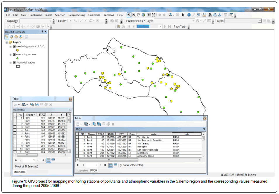 The second step regards the organization of the input data in the geo database. In other terms, a collection of one or more tables is stored in a relational structure that can be used by the Data Base Management System (DBMS). The aim of a DBMS is “to make data quickly available to a multitude of users whilst still maintaining its integrity, to protect the data against deletion and corruption, as well as to facilitate the addition, removal and updating of data as necessary” [24]. Figure 2 shows the vector data included into the GIS project and Table 1 gives details on the database table entered into the GIS project (Table 1). In particular, for each table the information sources, the fields and their short description have been provided. It is important to note that these database tables have been classified in two groups. The first group concerns the database tables which contain attribute information, in (.dbf) format, with no geographic reference. The other group includes the spatial and no spatial information, implemented within the GIS as features class. Finally, the satellite imagery of the area of interest, the level curves of the annual average concentrations of PM10 for the year 2009 and prediction maps obtained from geostatistical analysis have been also included as raster data.
