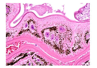 Figure 10: The lining cells of the inner tube are multinucleate and contain brown pigment.