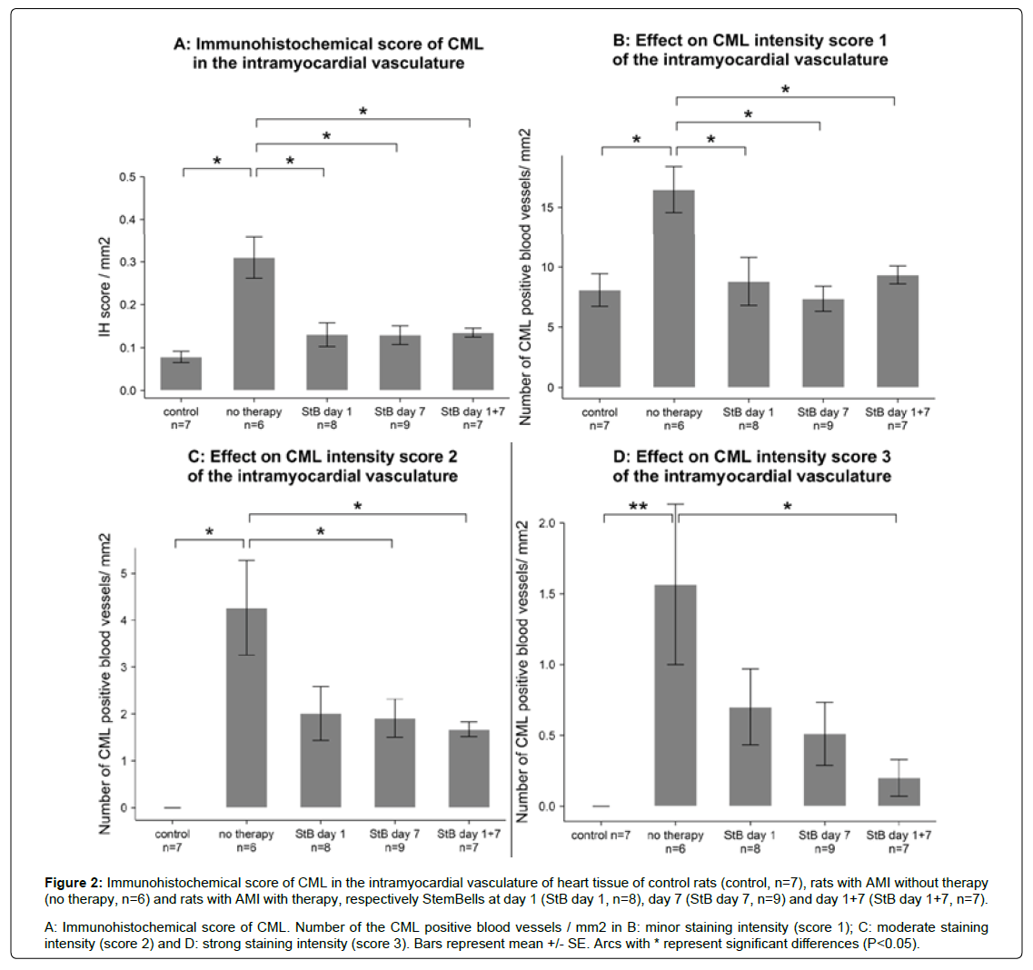 Figure 2: Immunohistochemical score of CML in the intramyocardial vasculature of heart tissue of control rats (control, n=7), rats with AMI without therapy (no therapy, n=6) and rats with AMI with therapy, respectively StemBells at day 1 (StB day 1, n=8), day 7 (StB day 7, n=9) and day 1+7 (StB day 1+7, n=7).