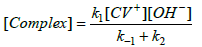 The stoichiometry of the reaction was determined via spectrophotometric titration. The absorbance at infinite time of solutions containing [NaOH]o in the range 6.67 × 10-4–3.50 × 10-3 M, [CV+]=1 × 10-5 M and μ=0.05 M were measured. However, from the plot of Absorbance versus [NaOH] curve, the stoichiometry was determined to be 1:1 (Figure 1).