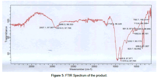 5. FTIR product analysis showing the presence of a carbinol with Sharp absorption at 1474.2 cm-1 signals the presence of C=C aromatic ring, the presence of O-H “free” is revealed from the sharp peak at 3650-3600 cm-1. Therefore, carbinol is suggested as the major product of the reaction (Figure 5).