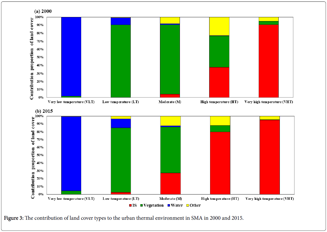 Based on the LUC classification maps and urban thermal effect maps, it is noteworthy that the amount of IS occupied a significant proportion in the area of VHT zone and HT zone in both 2000 and 2015, whereas water and vegetation had been exerting an enormous impact on the urban greenspace cooling island (UGCI). Obviously, rapid urbanization-induced land cover changes especially the rapid sprawls of IS, exacerbate urban thermal effects, while to some extent, the vegetation and water play a crucial role in controlling and mitigating the urban thermal effect.