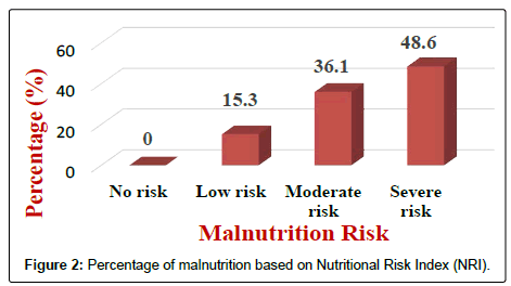Results of the NRI analysis indicated 84.7% were at moderate and severe malnutrition risk, compared with 72.3% detected as severe and moderate risk of malnutrition by using MUST. As expected the BMI values were higher in the No Risk group (26.8 ± 7 kg/m2) as compared to Mild Risk (23.7 ± 4 kg/m2), Moderate Risk (21.6 ± 5 kg/m2) or Severe Risk groups (20 ± 7 kg/m2) with P<0.5 in both tools (Figure 1). The patients were divided into four groups according to NRI scores identified as No Risk group (n=0), Mild Risk group (15.3%), Moderate Risk group (36.1%) and Severe Risk group (48.6%) (Figure 2). While based on MUST, malnutrition scores identified as mild risk (27.7%), moderate risk (30.6%) and severe risk (41.7%) (Figure 3). Moderate and severe malnutrition were more predicted by NRI compared by MUST (48.6%, 41.7%) and (36.1%, 30.6%) respectively. While mild risk of malnutrition was more predicted by MUST than NRI (27.7%, 15.3%) respectively (Figure 4).