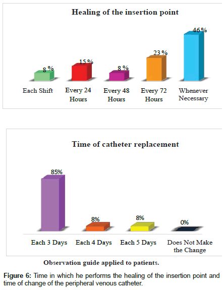 Performs the peripheral venous catheter insertion point every time it is necessary, followed by 23% who do it every 72 h, 15% every 24 h and lastly 8% do it every shift and every 48 h. Regarding the time to change the venous catheter, 85% performed the change every 3 days followed by 8% who performed every 4 days, in the same percentage they performed every 5 days (Figure 6).