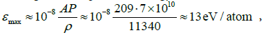 where P ≈ 5*1011 Pa ― the maximum pressure impulse in the contact plane of the projectile-target [23]; ABi = 209 amu - atomic mass of bismuth; ρ = 11340 kg/m3 is the density of bismuth.