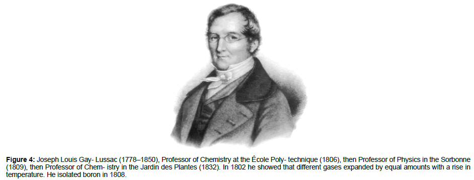 Figure 4: Joseph Louis Gay- Lussac (1778–1850), Professor of Chemistry at the École Poly- technique (1806), then Professor of Physics in the Sorbonne (1809), then Professor of Chem- istry in the Jardin des Plantes (1832). In 1802 he showed that different gases expanded by equal amounts with a rise in temperature. He isolated boron in 1808.