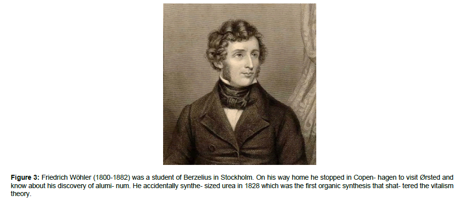 Figure 3: Friedrich Wöhler (1800-1882) was a student of Berzelius in Stockholm. On his way home he stopped in Copen- hagen to visit Ørsted and know about his discovery of alumi- num. He accidentally synthe- sized urea in 1828 which was the first organic synthesis that shat- tered the vitalism theory.